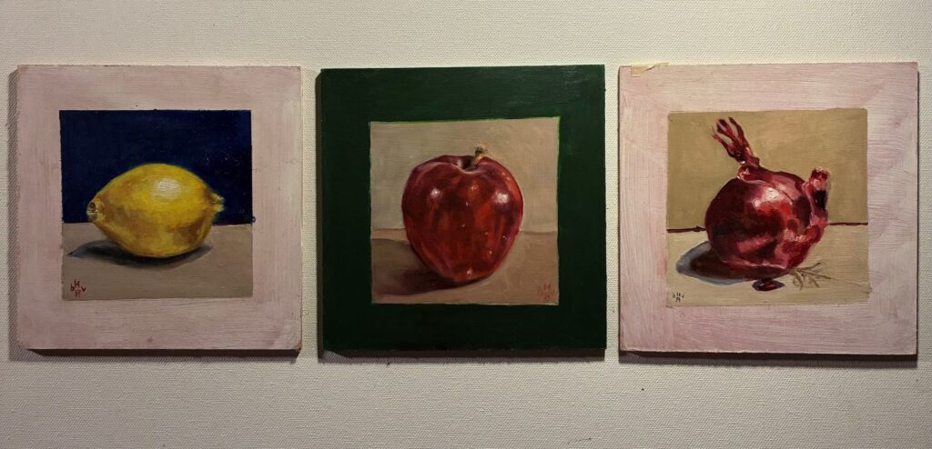 We doen dat met acrylverf en oefenen om los te schilderen. Lekker met een snelle toets en laagjes over en tegen elkaar en experimenteren met kleur waarbij we de kleurencirkel gebruiken.